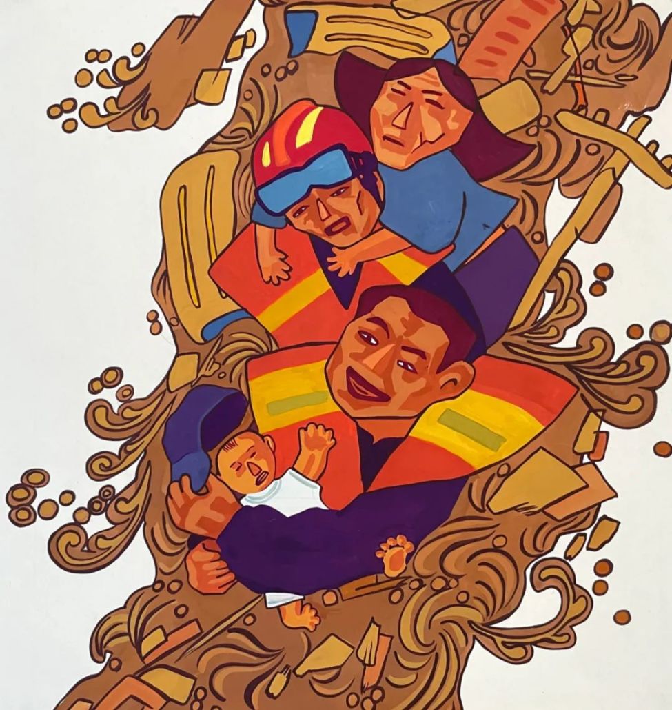 陈可乐老师表示,受到防汛救灾勇士英勇奋战的启发,根据消防指战员在前线时的真实场景,他们创作了《奶奶不怕,消防员背您转移!》《与时间赛跑,与洪魔抢命!》《生命之舟》《踏浪逆行,抢救生命!》 等作品。
