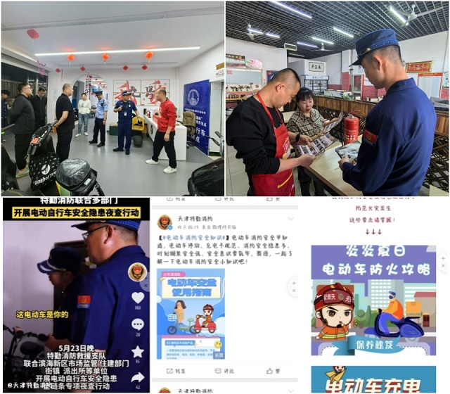 发送安全知识,广泛宣传引导。支队人员走进街边电动自行车销售点和维修部开展检查的同时,向商户和群众发放消防宣传材料和致居民群众消防安全一封信,现场“面对面”讲述电动车发生火灾的原因、防范措施,提示商户不准私自改装电动自行车及电池,在销售中要向顾客普及正确充电的注意事项和相关防火常识,从销售源头上把控火灾事故发生。同时整合支队官方微信、微博、抖音等新媒体资源,发布电动车消防安全警示教育、逃生自救知识等,引导网民参与互动,掀起了群防群治的学习高潮。