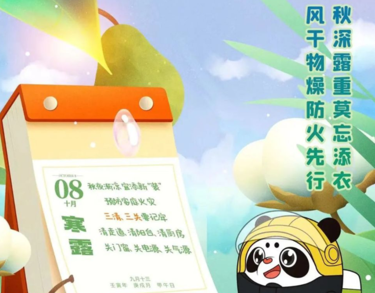 秋意渐浓,更深露重 数着南飞的大雁 闻着桂花扑鼻的芬芳 看橙黄橘绿挂枝头 2022年10月8日 我们迎来了秋季的第五个节气: 寒露 进入寒露,气候开始从凉爽过渡到寒冷 大自然呈现一派深秋景象 时有冷空气南下 昼夜温差较大 生产生活用火、用电等大量增多 同时秋燥明显加重 火灾危险性加大 消消提示小伙伴们 防寒的同时,勿忘防火