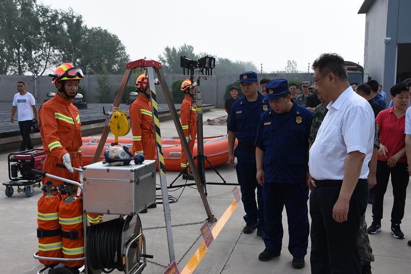 8月5日,静海区区委书记蔺雪峰、区长金汇江带领区政府办、应急管理局、人武部等部门领导检查支队防汛应急救援准备工作。