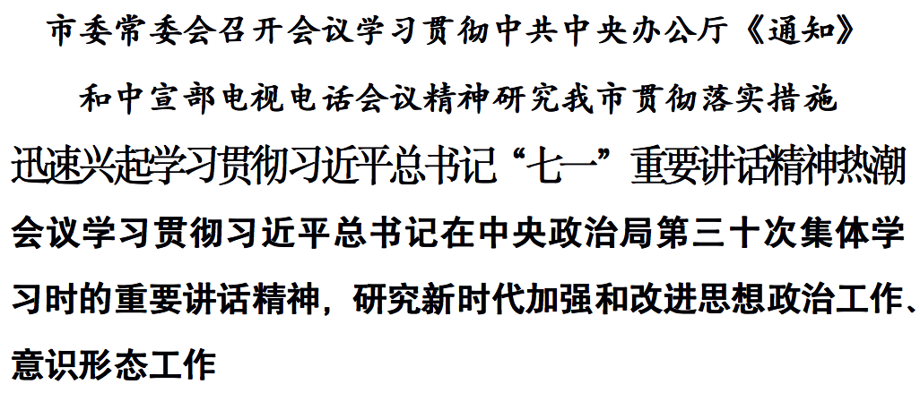 7月5日下午,市委常委会会议暨市委宣传思想工作领导小组会议召开,学习贯彻中共中央办公厅《通知》和中宣部电视电话会议精神,研究部署我市学习宣传贯彻习近平总书记“七一”重要讲话精神工作。学习贯彻习近平总书记在中央政治局第三十次集体学习时的重要讲话精神,研究新时代加强和改进思想政治工作、意识形态工作。市委书记、领导小组组长李鸿忠主持并讲话,市委副书记、市长廖国勋,市人大常委会主任段春华,市政协主席盛茂林出席。