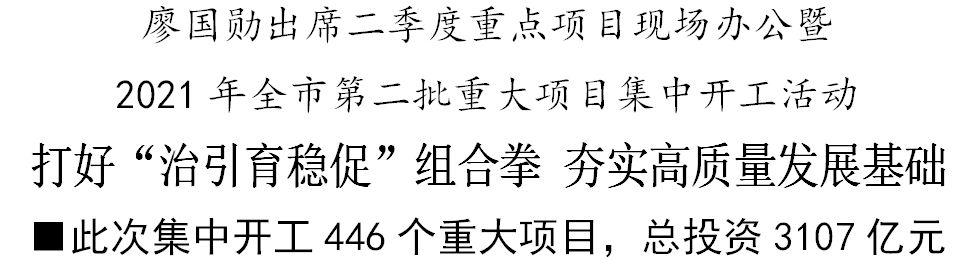 市委副书记、市长廖国勋出席并宣布开工。市发展改革委主要负责同志介绍项目总体情况,16个重大项目现场进行了视频连线同步开工。此次集中开工446个重大项目,总投资3107亿元。