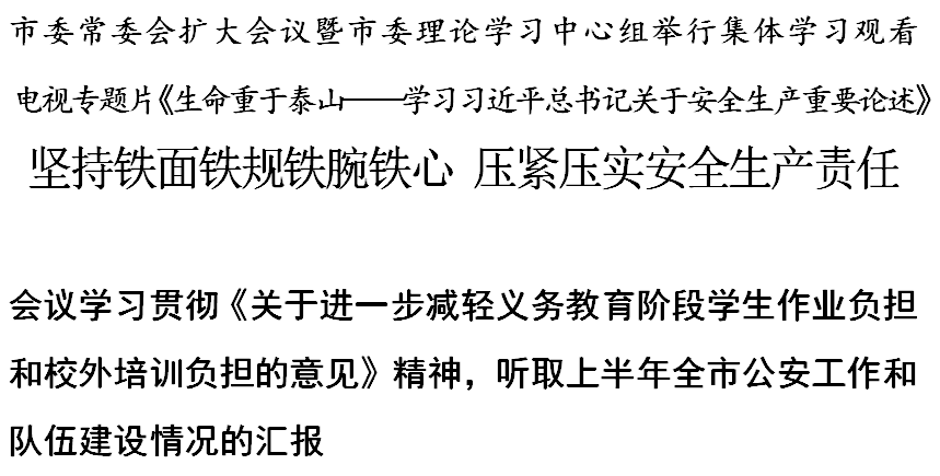 会议学习贯彻中共中央办公厅、国务院办公厅印发《关于进一步减轻义务教育阶段学生作业负担和校外培训负担的意见》精神,研究我市贯彻落实措施。会议强调,要深刻认识到深入推进“双减”工作是事关全面贯彻落实党的教育方针、立德树人根本任务和培养社会主义建设者、接班人的重大决策部署,是事关促进学生全面发展、健康成长,广大家长十分关心关切的重要民生工作、民心工作,是一项涉及社会方方面面的复杂工程。我们要进一步提高政治站位,强化责任担当,高质量完成各项任务,确保“双减”工作取得扎实成效。要充分发挥专门工作机构统筹协调作用,严格落实各区属地责任,积极探索创新,鼓励试点先行,不等不靠不观望,为全市提供可借鉴、可复制的经验。要加强宣传舆论引导,为做好“双减”工作营造良好社会氛围。